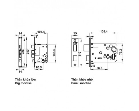 + Kích thước thân khóa trong: 78 x 232 x 30 mm